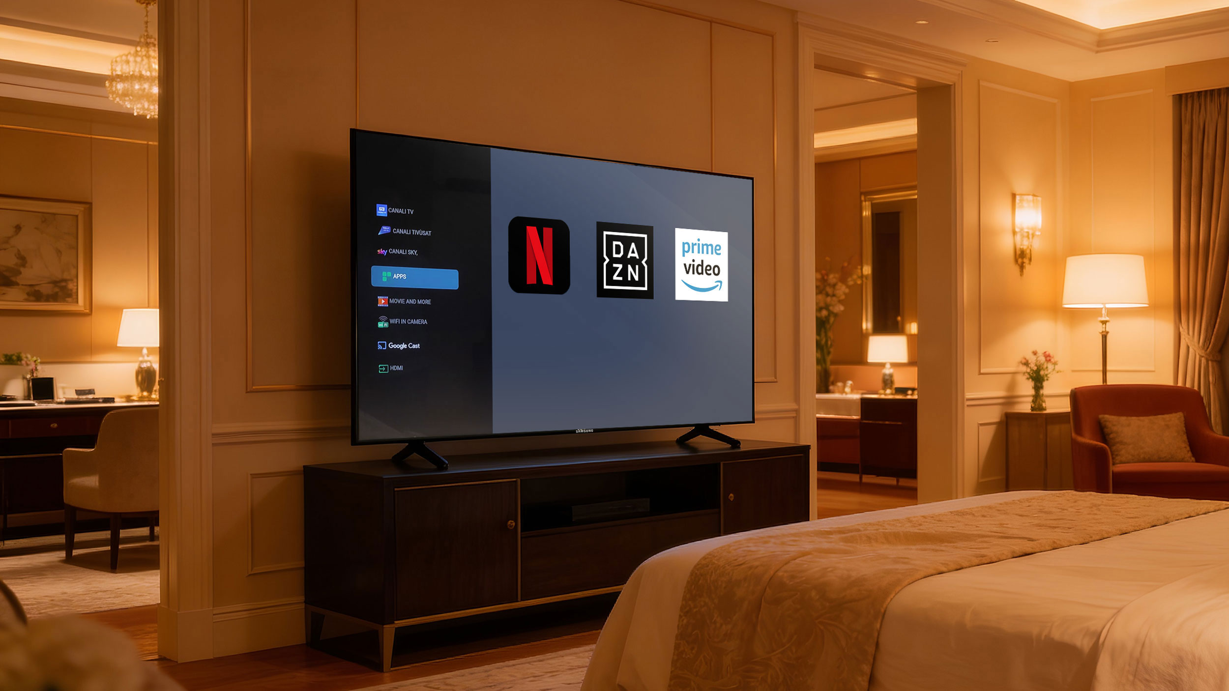 Hech Romeo è la piattaforma di digital concierge che trasforma ogni Hospitality TV Samsung in un punto di contatto intelligente tra la struttura e l’ospite. Progettata per integrarsi nativamente con LYNK Cloud e con Tizen, il sistema operativo proprietario di Samsung, ha superato tutti i livelli di compatibilità per le principali piattaforme di streaming: Chromecast, Google Cast, Netflix, DAZN, Prime Video e altre, garantendo agli ospiti un accesso sicuro e immediato ai propri contenuti preferiti.