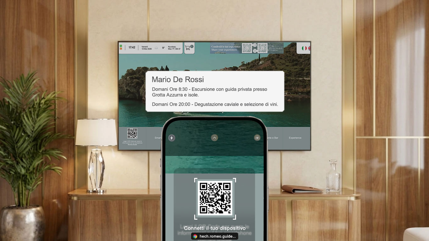 Hech Romeo gestisce in autonomia l’azzeramento delle cronologie di navigazione e dei dati di sessione al checkout, senza la necessità di integrare gestionali o interfacce aggiuntive. La piattaforma opera come una concierge digitale completa, “vestendo” ogni TV con immagini, video, testi, prodotti e servizi della struttura e coinvolgendo l’ospite in un’esperienza digitale a 360 gradi: welcome screen personalizzata, room directory, menu del ristorante, prenotazione spa, promozioni mirate oltre a immagini, video e banner diversificati durante gli eventi.